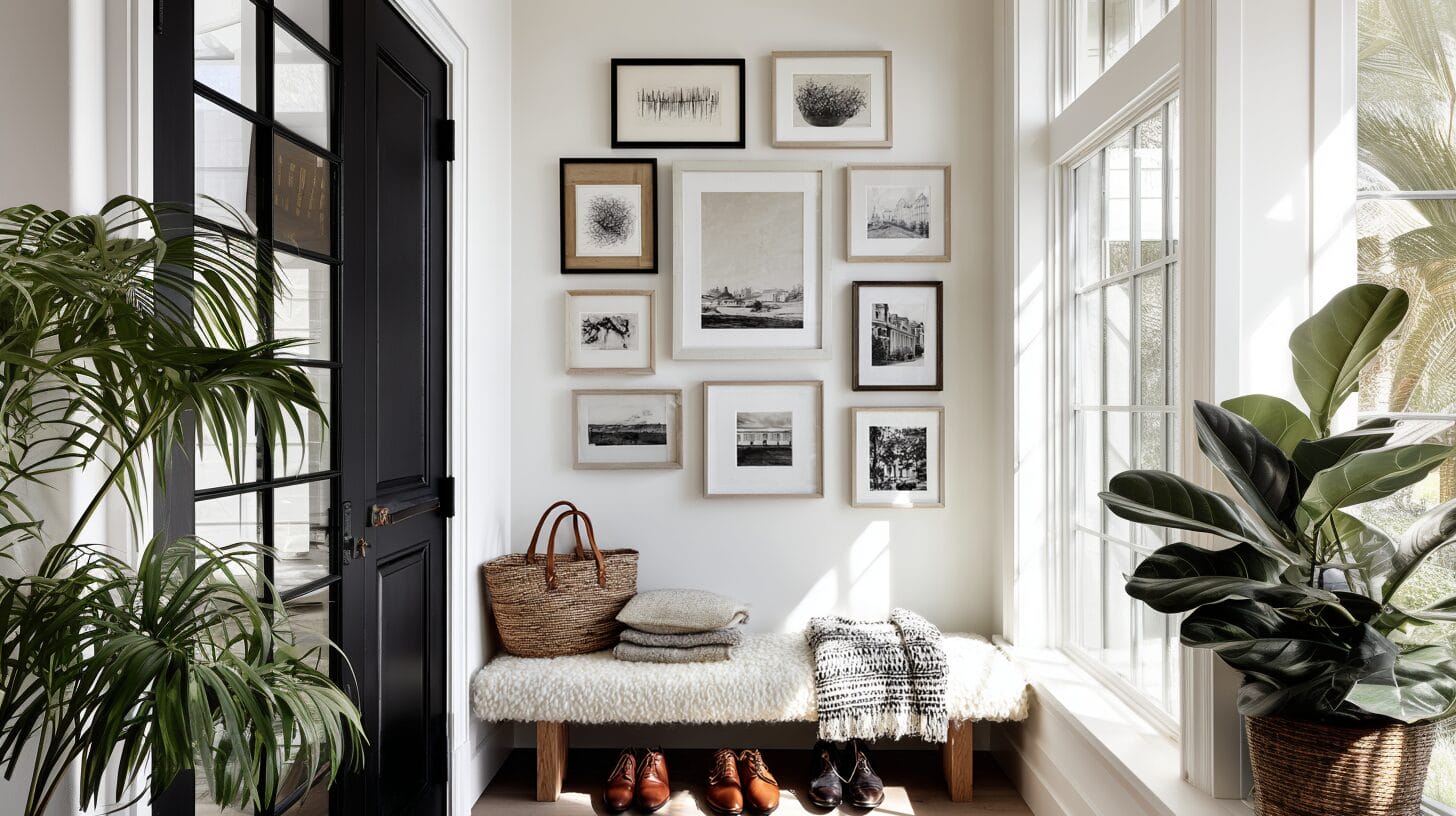This bright, welcoming entryway features a neutral gallery wall with a mix of sketches and architectural prints in black, white, and wood frames. A cozy shearling bench, woven tote, and folded throws add warmth and texture, creating a timeless, effortlessly styled space bathed in natural light.