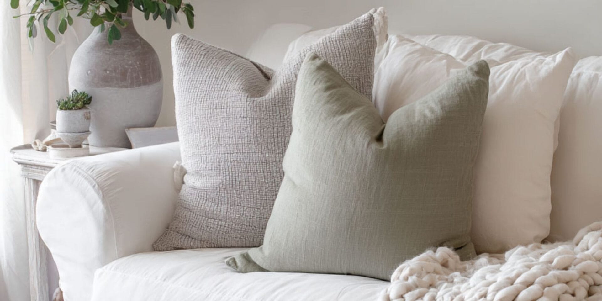 A soft and inviting white slipcovered sofa is styled with a sage green pillow, textured neutrals, and a chunky knit throw. A woven basket, ceramic vase with greenery, and rustic side table complete the cozy, natural living room look.