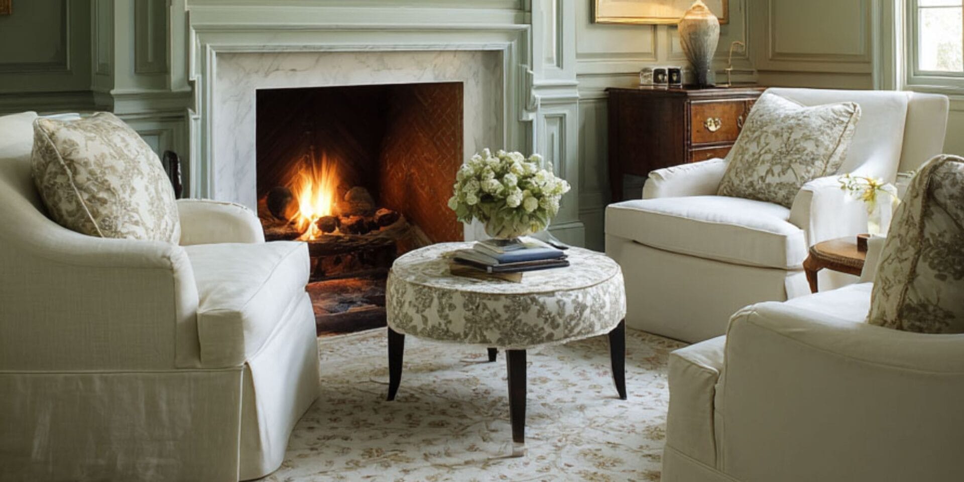 A traditional living room with sage green paneled walls feels timeless and refined. Classic white armchairs, a marble fireplace, botanical artwork, and an elegant patterned rug create a cozy yet sophisticated atmosphere.