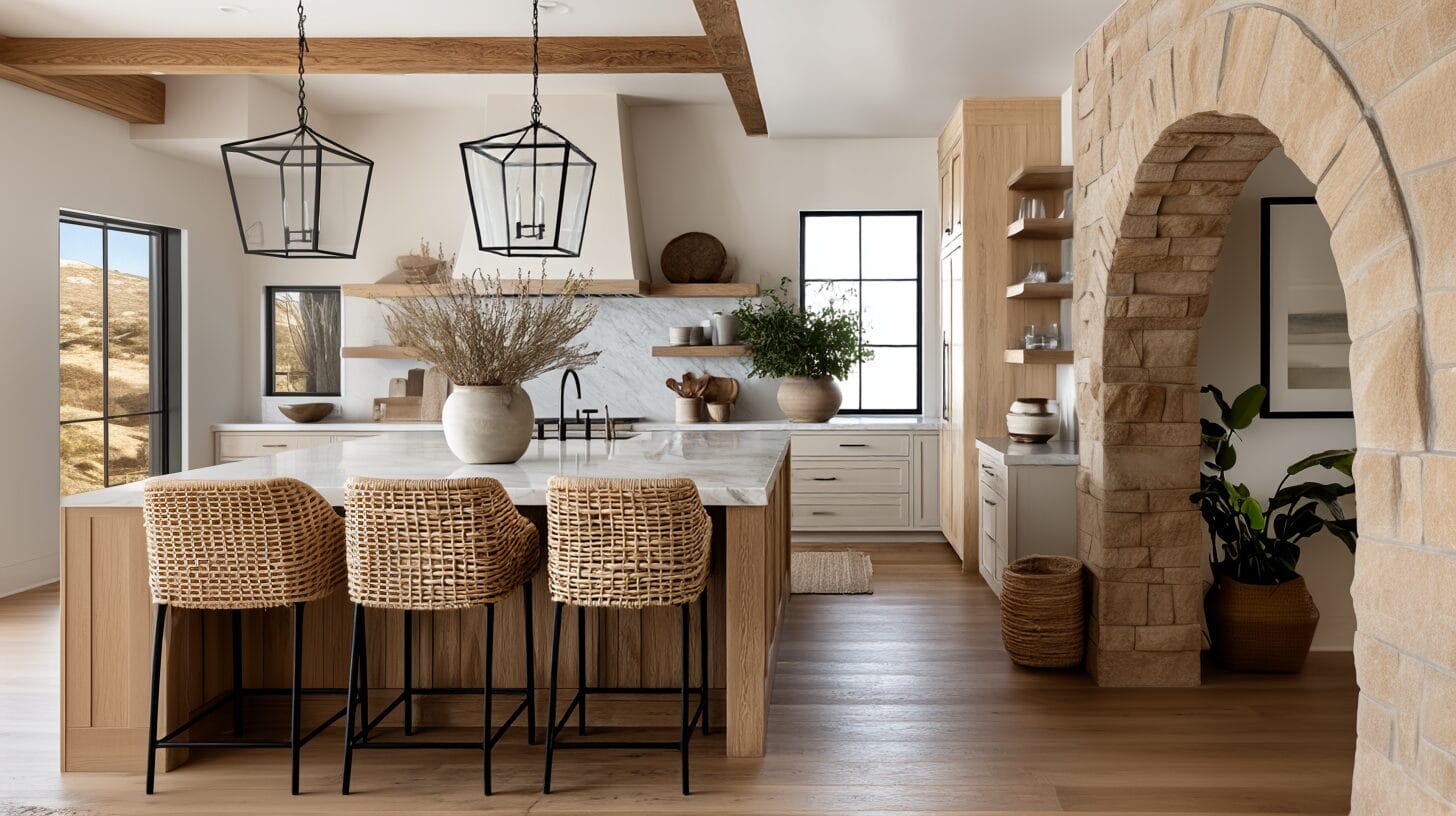 This kitchen perfectly blends rustic warmth with clean, modern lines using natural stone, light wood cabinetry, and exposed ceiling beams. The oversized stone island becomes the focal point, layered with woven stools, soft textiles, and organic decor for a relaxed, collected feel. It’s a timeless look that feels both elevated and welcoming—exactly the kind of kitchen Pinterest users love saving.